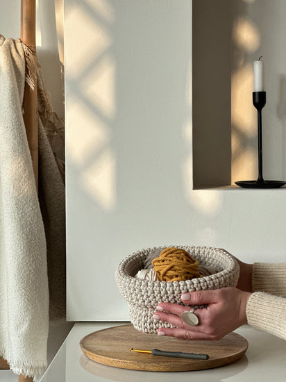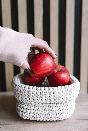 A modern crochet basket with a foldover edge — simple, textured, and versatile. Perfect for kitchen storage, fruit, or small everyday essentials, it brings a handmade touch of minimalism to any home.