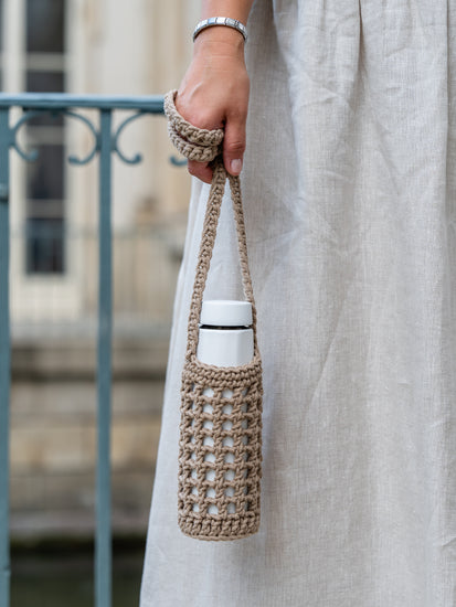 Carry your water bottle in style with this modern crochet holder. Designed with a minimal aesthetic and an airy, textured pattern, it’s both practical and beautiful. The long strap makes it easy to wear crossbody, leaving your hands free whether you’re on a walk, at the market, or exploring outdoors. A versatile accessory that combines functionality with a handmade touch, it’s a project that adds charm to everyday routines.